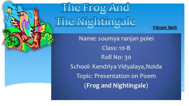 Start by marking the frog and the nightingale as want to read vikram seth is an indian poet, novelist, travel writer, librettist, children's writer, biographer and memoirist. The frog and the nightingale is a poem written by the indian poet vikram seth in 1994. The poet • vikram seth was born in calcutta in 1952. At the beginning of the poem, we come to know that the frog has full confidence in itself and is proud of its singing though it lacks the skills.