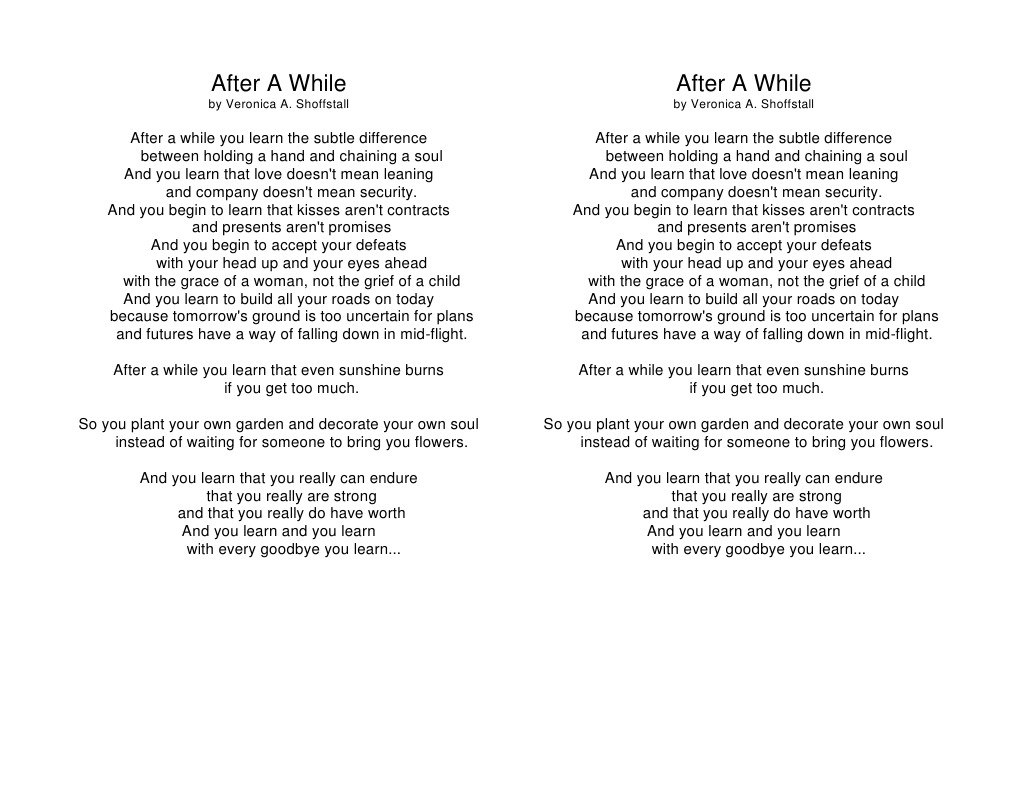 31+ With Every Goodbye You Learn Poem PNG. Shoffstall after a while you learn the subtle difference between holding a hand and chaining a soul and you learn that love doesn't mean leaning and company doesn't always mean security. After the death of my husband at only 39 from a 10 year battle with cancer in 1994 i learned that he carried the same poem with him in his wallet to give him strength to fight his battle, never knowing that at …