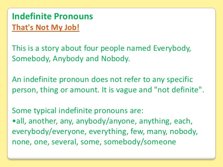 It is 'not definite' and vague. This resource comes with a single user license and may not be reproduced, resold, redistributed, or altered in any form. As such they are called indefinite. An indefinite pronoun takes the place of a noun without referring to a specific person, place, or thing.