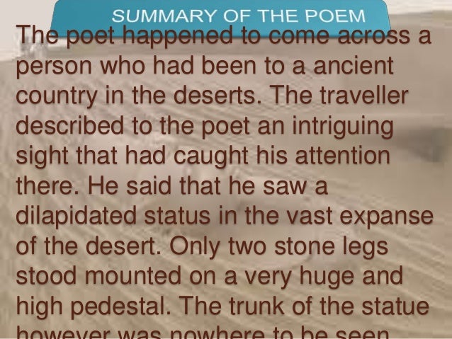 Identify and rewrite the lines from the poem spoken by the narrator, the traveler and ozymandias Two vast and trunkless legs of stone stand in the desert. You can find that there is a list of all poems in book iii here and the notes and questions answers and the explanation is given for each and every poem. In the poem, ozymandias was so proud of his own power and so bent on asserting it that he commissioned a great sculpture of himself glorifying his own authority.